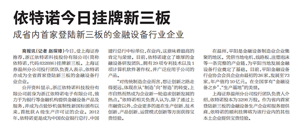 今日,浙江依特诺科技股份有限公司(简称依特诺,代码832886)挂牌新三板。依特诺亦成为全省首家登陆新三板的金融设备行业企业。