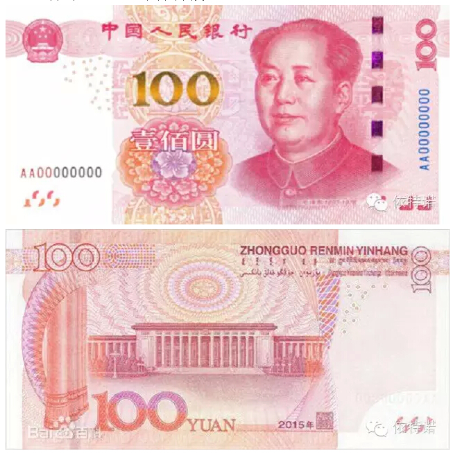 2015年版第五套人民币100元纸币在保持规格、主图案、主色调等与2005年版第五套人民币100元纸币不变的前提下,对票面图案、防伪特征及其布局进行了调整,提高机读性能,采用了先进的公众防伪技术,使公众更易于识别真伪。